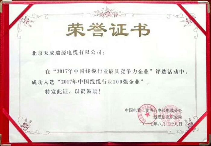 大會(huì)以“提質(zhì)量、強(qiáng)防范、樹品牌”為主題,揭曉了“中國(guó)線纜行業(yè)最具競(jìng)爭(zhēng)力企業(yè)10強(qiáng)”和“中國(guó)線纜行業(yè)100強(qiáng)企業(yè)”等榜單。北京天成瑞源電纜有限公司憑著良好的產(chǎn)品質(zhì)量、美譽(yù)度以及綜合實(shí)力等優(yōu)勢(shì),獲得中國(guó)電器工業(yè)協(xié)會(huì)和電纜信息研究院共同頒發(fā)的“2017年中國(guó)線纜行業(yè)100強(qiáng)企業(yè)”榮譽(yù)證書。并排名55名?。?